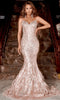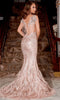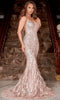 Step into the spotlight with this breathtaking evening gown from Portia and Scarlett. A masterpiece of artistry, this gown is adorned with exquisite embellishments that shimmer and gleam. The fitted bodice hugs your curves, accentuating your décolletage with its deep V-neck and delicate spaghetti straps. The open back adds a touch of allure, while the crystal-beaded fringe and feathered detailing create a captivating effect. The skirt flares into a stunning mermaid silhouette, its full-length hem and sweeping train trailing behind you like a celestial dream. Available in a radiant palette of Rose Gold, Cobalt, and Silver, this Portia and Scarlett creation will ensure you shine brighter than the stars on your special day.