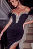 Ladivine Off Shoulder Fringe Prom Dress Beaded Slit Evening Gown CC324 Black/Nude