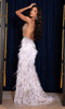The sheath skirt is a masterpiece of artistry, adorned with delicate feather fringes and embellishments that dance with every movement. A center slit and sweeping train add a touch of drama and flair, ensuring you leave an unforgettable impression. Crafted in a stunning Silver Nude color, this gown evokes your inner goddess and transforms you into a vision of ethereal beauty.