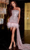 Elevate your style and captivate attention in this breathtaking Portia and Scarlett masterpiece. This figure-flattering dress is adorned with sparkling beadwork and sequins that glisten from top to bottom. It showcases a strapless straight-across neckline and a natural waistline that gracefully transitions into a stunning side draped accent. The sheath skirt concludes with a short length hem embellished with a dramatic feathered design that adds a touch of opulence. Wearing this Portia and Scarlett cocktail dress will make you feel regal and radiant, exuding an aura of regal elegance.