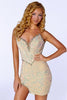Prepare to captivate the spotlight in this breathtaking Portia and Scarlett PS24641 dress. Its deep V-neckline adorned with intricate beadwork will draw all eyes to your décolletage. Shimmering sequins cascade over the dress, catching the light and adding a touch of glamour to your every move. The strapless silhouette effortlessly highlights your shoulders and collarbone, while a side slit adds a hint of sophistication. Designed with corset boning for a perfect fit, a lace-up back for added elegance, and a short hemline for a playful touch, this dress is a showstopper. Available in a captivating array of hues, including Nude, Blue, Pink, and Mint, this masterpiece will make a lasting impression at your special event.