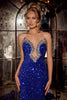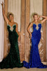 Introducing the captivating Portia and Scarlett PS23683 gown, a masterpiece of opulence and sophistication. Its plunging V-neckline, adorned with stunning jewels, creates a striking focal point that demands attention. Made entirely of shimmering sequins, this gown envelops the wearer in a radiant cascade that enhances every movement. The mermaid silhouette beautifully accentuates curves with elegance and sophistication, while the strapless design exudes timeless charm. An illusion inset adds an intriguing touch, complementing the sequined fabric flawlessly. Completing the look is a sweeping train that adds drama and grandeur to this mesmerizing dress. Available in Black, Emerald, and Cobalt, the Portia and Scarlett PS23683 masterpiece effortlessly combines opulence and sophistication, making it a showstopping choice for any formal occasion.