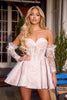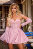Indulge in the captivating allure of this Portia and Scarlett cocktail dress, a masterpiece that exudes glamour and sophistication. Its shimmering glitter lace silhouette dances with light, creating an ethereal glow that will make you the center of attention. The sweetheart neckline frames your décolletage with elegance, while the corset boning ensures a flawless fit that accentuates your curves. The strapless design showcases your shoulders and collarbone with grace, and the detachable long sleeves offer versatility for a range of occasions. With its flattering mid-rise and short A-line silhouette, this dress flatters your figure beautifully. Available in a palette of Black, Blue, Pink, and White, this Portia and Scarlett masterpiece is the perfect choice for making a statement at any special event.