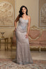 This dress combines sequin mesh with a sheer, intricately beaded illusion bodice.