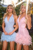 Embrace the epitome of elegance and grace with this captivating cocktail dress from Portia and Scarlett. Its fitted bodice adorned with sparkling sequins adds a touch of glamour, while the sleeveless design, plunging V-neckline, and wide halter shoulder straps create a stylish and alluring silhouette. The open back showcases a crisscross lace-up tie, balancing sensuality and charm. A satin belt cinches at the waist, accentuating your figure, while the mid-thigh sheath skirt and playful feathered hem complete the look. Available in Blue, Pink, or White, this mesmerizing creation is sure to make you shine with the glow of everlasting beauty.