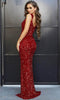 Embody your vision of radiant beauty in this exquisite Portia and Scarlett creation. This gown is meticulously tailored with intricate seams and adorned with shimmering sequins that dance in the light. The contoured V-neckline elegantly frames your décolletage, while the graceful shoulder straps create a flattering silhouette. The deep V-open back adds a touch of allure, while the convenient zipper closure ensures a secure and comfortable fit. The sheath skirt features a daring slit that allows you to move with effortless grace, cascading to the floor in a sweeping train that exudes drama. Flaunt your exceptional style and leave a lasting impression in this Portia and Scarlett masterpiece, a testament to elegance and eloquence.