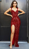 Embrace your vision of elegance and eloquence in this breathtaking Portia and Scarlett creation. Meticulously tailored with shimmering sequins, this gown captivates with its enchanting radiance. The contoured V-neckline and graceful shoulder straps flatter your figure, while the deep V-open back adds a touch of allure. The sheath skirt flows effortlessly with a daring slit, allowing you to move with grace. A sweeping train adds a touch of drama, making this gown a true masterpiece. Flaunt an exceptional style that exudes sophistication and leaves a lasting impression wherever you go.