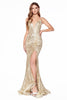 Radiate elegance and glamour in this mesmerizing Cinderella Divine CR844 mermaid gown. Tailored to flatter your figure, this striking piece features captivating glitter embellishments that will shimmer under the lights. The illusion plunging V-neckline and sleeveless fitted bodice accentuate your curves, while the mid-open back adds a touch of allure. Triple slender straps provide support and create a stunning silhouette. The daring thigh-high leg slit and horsehair ribbon hem add a touch of jazziness, ensuring you'll sparkle throughout the event. Step into the spotlight and captivate every gaze in this Cinderella Divine masterpiece that exudes both elegance and glamour.