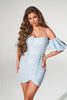 Embrace your inner goddess with the captivating Portia and Scarlett PS23079 dress. This exquisite creation is designed to make a statement and is sure to turn heads. The shimmering sequin texture exudes glamour and catches the eye, while the strapless bodice and delicate spaghetti straps add a touch of elegance. Corset boning ensures a flattering and supportive fit, while intricate bead embellishments elevate the look. Detachable puff sleeves allow for versatility, adding a playful touch. The faux wrap skirt adds a hint of sophistication, and the mid-rise back and short hemline add allure to the overall look. Available in Light Blue, this Portia and Scarlett masterpiece is guaranteed to make you command attention and shine in the spotlight.
