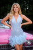 Indulge in the epitome of elegance and grace with this captivating cocktail dress from Portia and Scarlett (PS24208). Its fitted bodice is adorned with sparkling sequins, adding a touch of glamour to any occasion. The sleeveless design features a plunging V-neckline and wide halter shoulder straps for a stylish look. The open back showcases a sensual crisscross lace-up tie design, balancing allure with charm. To accentuate your figure, this dress comes with a satin belt that cinches at the waist. The mid-thigh sheath skirt and playful feathered hem complete the look, creating a mesmerizing silhouette. Choose from the vibrant Blue, delicate Pink, or timeless White colors and radiate with the glow of everlasting beauty in this enchanting creation by Portia and Scarlett.