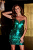 Step into the realm of opulence with the captivating Portia and Scarlett PS23120 cocktail dress. This masterpiece exudes glamour, adorned with intricate sequins that dance and shimmer under the lights. The strapless V-neckline draws attention to the décolletage, while the basque waist cinches the figure, creating an hourglass silhouette. The sheath skirt hugs every curve, culminating in a short hemline that adds a touch of allure. Available in a range of vibrant colors, this Portia and Scarlett creation is the epitome of elegance and will ensure you shine all night long.