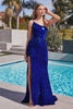 Immerse yourself in the enchanting allure of the Cinderella Divine CH111 gown. Shimmering sequins adorn the fabric, creating a mesmerizing texture that will captivate all eyes. The asymmetrical neckline, supported by delicate spaghetti straps, adds a touch of modern elegance. The fitted bodice accentuates your curves, while the mid-rise back provides a sophisticated finish.