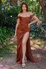 This exquisite satin gown embodies elegance and structure. The fitted bodice, adorned with corset boning, creates a flattering silhouette, while the draped cowl neckline adds a touch of sophistication. Versatile in design, this gown features detachable spaghetti straps and the option for off-shoulder sleeves, allowing you to customize your look to perfection. The sheath silhouette of the skirt flows gracefully in a full-length hem, enhanced by a daring thigh-high slit that exudes allure. As you move, a sweeping train adds a touch of drama, creating a magnificent exit. The epitome of grace and charm, this gown is the perfect choice for any formal event.