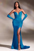 The Cinderella Divine CD889 gown is a vision of elegance and sophistication. Its strapless bodice features a sweetheart neckline adorned with an exquisite illusion inset, creating a harmonious blend of modesty and allure. The gown is further enhanced with gathered ruching that adds depth and texture, showcasing meticulous attention to detail. The shirring all over imparts a sense of luxury, while the high slit on the skirt adds a touch of drama and movement. The dress flows gracefully into a mermaid silhouette that exquisitely flatters your curves, and the draped train enhances the sense of grandeur. To complete the ensemble, a matching pair of gloves is included, adding an extra touch of refinement and sophistication to this Cinderella Divine masterpiece.