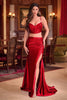 The provocative leg slit adds a touch of daring, promising a night of confident elegance. This gown is not just a dress; it's a statement, an embodiment of youthful allure and sultry style. With each satin fold and every twirl, let this two-piece ensemble be your ticket to a prom night filled with unforgettable moments and lingering glances.