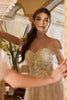 Step into a realm of elegance and sophistication with the Cinderella Divine A0822 evening gown. This captivating dress features an off-the-shoulder silhouette that accentuates your décolletage, while the draped tulle sleeves and corset boning upper add a touch of allure. Birds of romance lace appliqués dance across the entire ensemble, creating a mesmerizing and enchanting look. The pleated A-line skirt flows effortlessly into a sweeping train, adding a touch of drama to your entrance. Crafted with meticulous attention to detail, this dress is a testament to timeless beauty and sophistication. Prepare to leave an unforgettable impression at any formal event you grace with your presence.