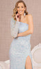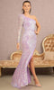 Dazzle and sparkle in the enchanting GLSbyGloria GL3128 gown. Its figure-hugging bodice showcases the mirrored asymmetrical neckline and partially open back, creating a flattering silhouette. The single long sleeve with a feather motif adds a touch of whimsy. The sleek skirt follows a sheath silhouette, cascading into a full-length hemline with a sweeping train. A high-thigh slit provides a tantalizing glimpse of leg, adding a touch of allure. Choose from the elegant Baby Blue or Lilac shades and exude poise and sophistication in this stunning ensemble.